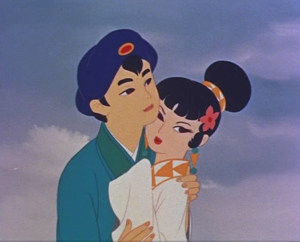 Entsprechend prächtig sieht der Film dann auch aus. Zwar wirken gerade die Designs von Hintergründen und Figuren heute reichlich altbacken und einige Schwierigkeiten, wie die richtige Mimik der Figuren, fallen deutlich auf, aber darüber hinaus sind viele Bewegungen erstaunlich flüssig, es gibt spiegelndes Wasser oder transparente Objekte wie Vorhänge und Szenen voll von Bewegungen wie fallende Blüten und Blätter oder einen großen Fischschwarm. Hinzu kommt das man auch generell ein gutes Händchen für eine schöne Bildsprache hatte. Da wäre z. B. die Szene in der Xu-Xian und Bai-Niang hinter einem Busch verschwinden und im selben Moment zwei Schmetterlinge aus diesem auftauchen und umeinander herumflattern. Und auch das Intro im Stil eines klassischen Schatten-Puppenspiels ist sehr gelungen.